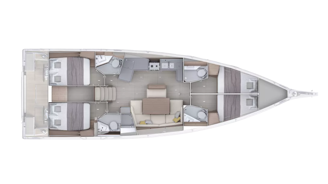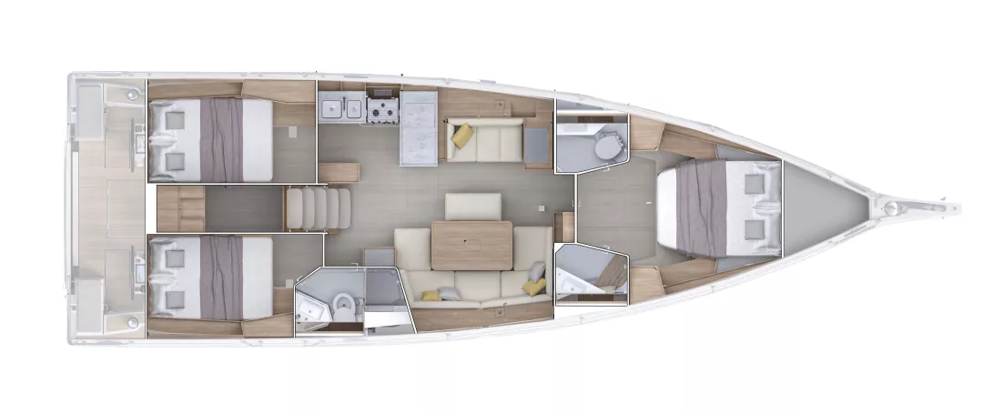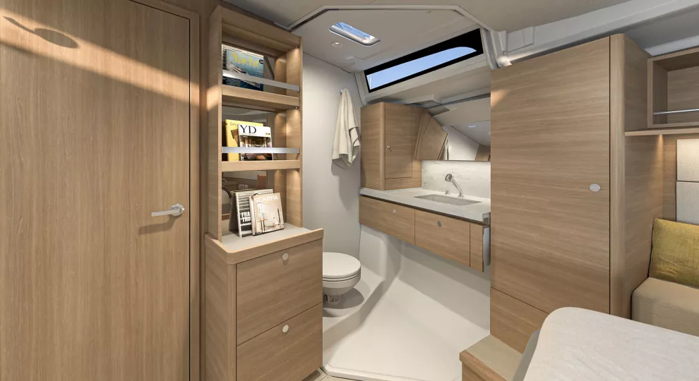 You will love the owner’s suite, the focal point of this amazing interior, for its spaciousness and premium atmosphere. Designed for absolute comfort, it has an upholstered headboard, a spacious 160 cm bed, and plenty of storage space: two hanging lockers, large coaming compartments and a large drawer under the bed.