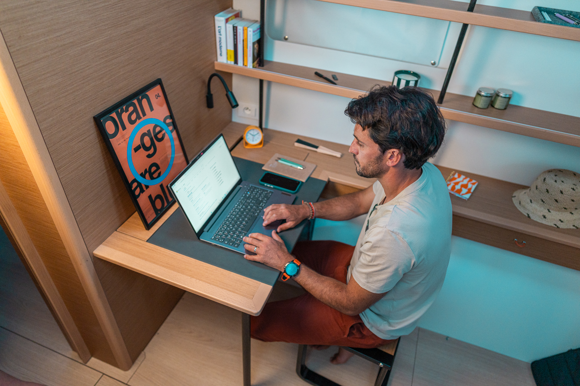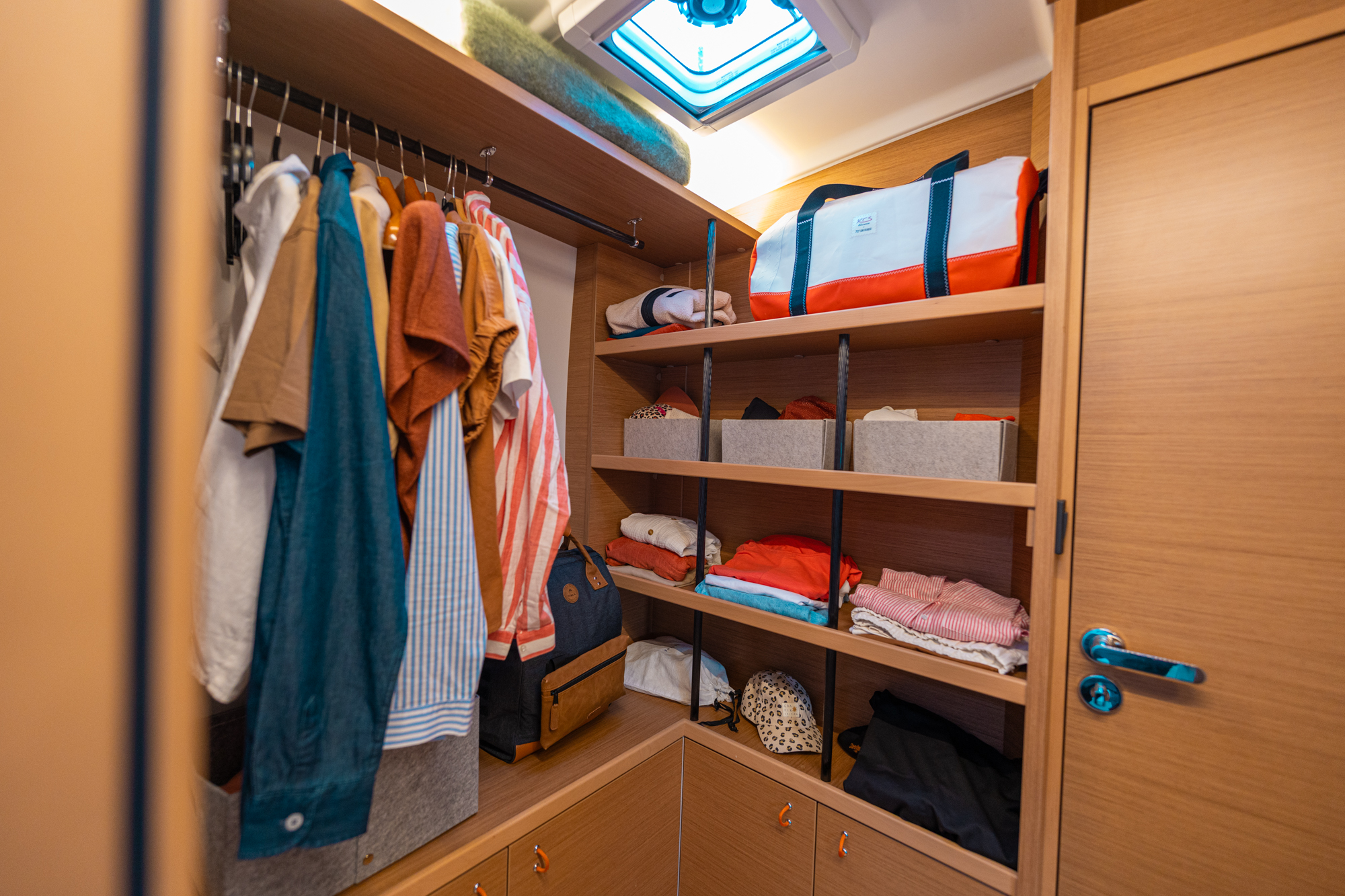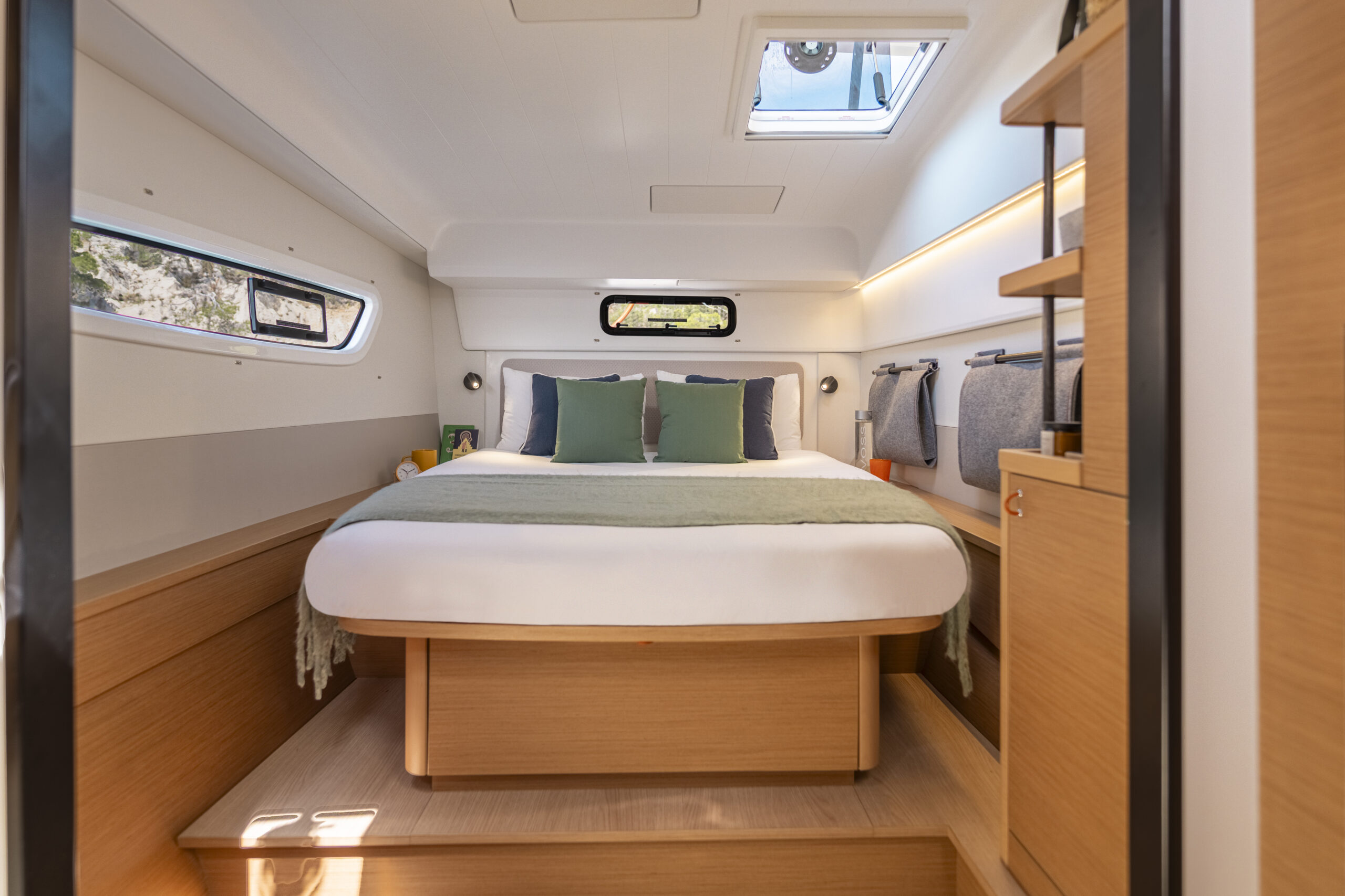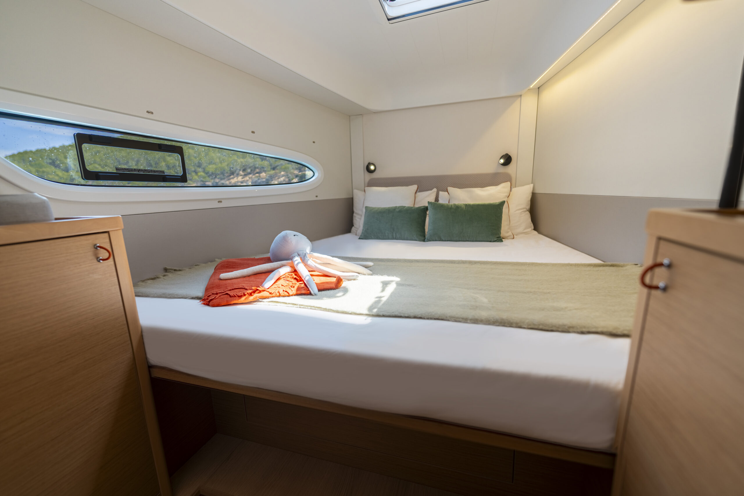 The hull dedicated to owners combines a spacious cabin with a large forward heads compartment and, a rare feature on a boat of this size, a large closet. It also features an ergonomically designed desk area with natural light for the boat office. Complementing the chart table, it offers a second workspace, allowing you to reconcile your professional life with your passion for the sea as never before.