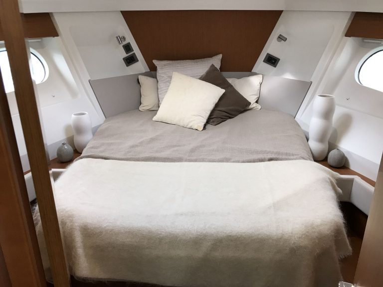 Flexible living is well thought out again with a swivel seat to the extendable table which can comfortably seat seven or eight people. Again, there are great views from the flybridge and extra space on the back deck for a couple of deckchairs. The slide-out icebox is a nice addition for entertaining.